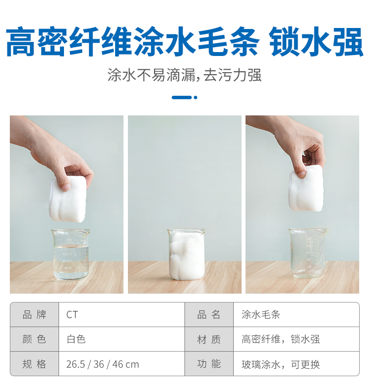 將塗水器浸入桶中,待充分吸入清潔液後用手輕(qīng)輕捋一下(以不往下滴水(shuǐ)為宜),均勻(yún)塗在玻璃表麵,去除表麵的汙漬。