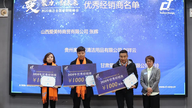 在大(dà)會頒獎環節,頒獎嘉賓分別向2020有突出貢獻的17c.嫩草网在线观看免费經銷商進行頒獎,山西愛美特(tè)商貿有限公司(sī)、貴州(zhōu)奧麗(lì)齊清潔(jié)用品有限公司、甘肅愛科林科技有限公(gōng)司(sī)榮獲“202017c.嫩草网在线观看免费優秀經銷商”稱號。