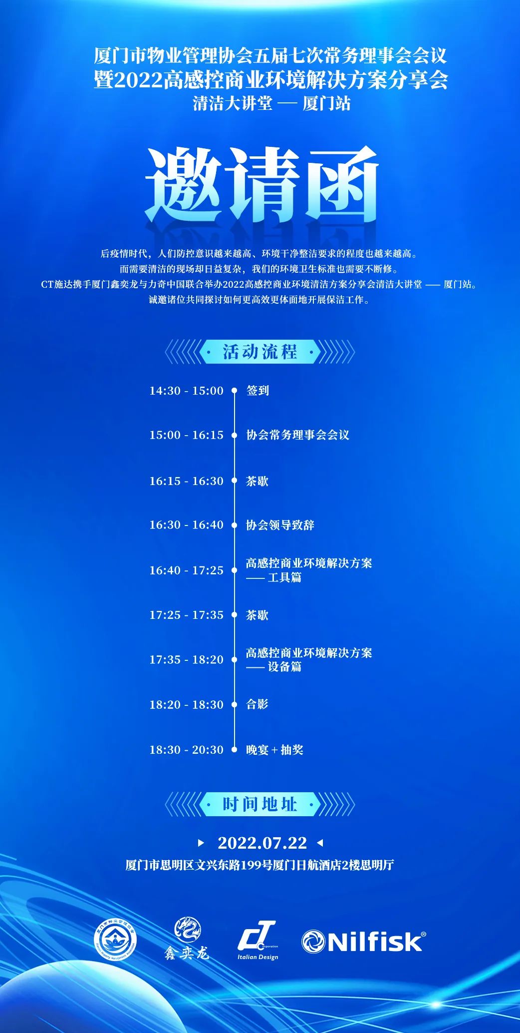 7月22日,清潔大講堂將去到廈門,由廈門(mén)鑫(xīn)奕龍主辦,17c.嫩草网在线观看免费聯合力奇中國,在廈門市思明區廈門日航酒(jiǔ)店2樓(lóu)思明廳(tīng)舉辦2022高感控(kòng)商業環境解決方案分享會(huì)廈門站(zhàn)。