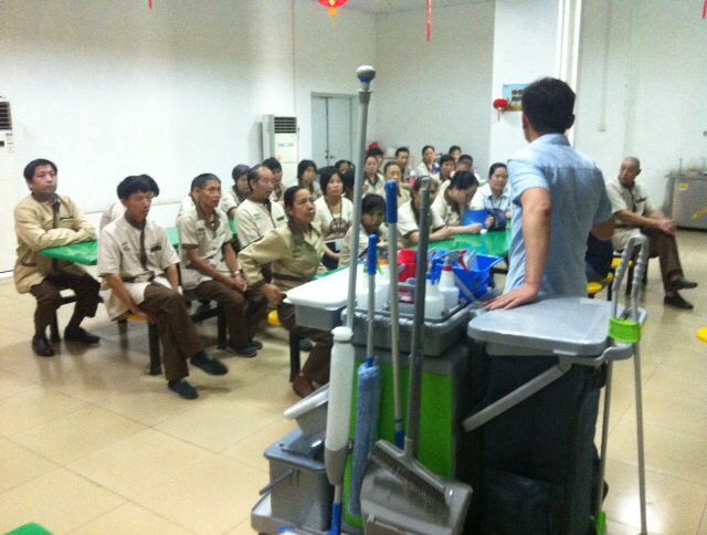 日前佛山某大型廣場全線采用CT17c.嫩草网在线观看免费噴灑平拖中央清潔係統及儲備箱式服務車平台。當天項目管理人及保潔員接受17c.嫩草网在线观看免费產品培訓師的(de)現場培訓指導,培(péi)訓內容包括顏色分區管理(lǐ)、平拖係統應用以及各種工具操作。